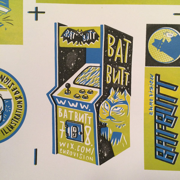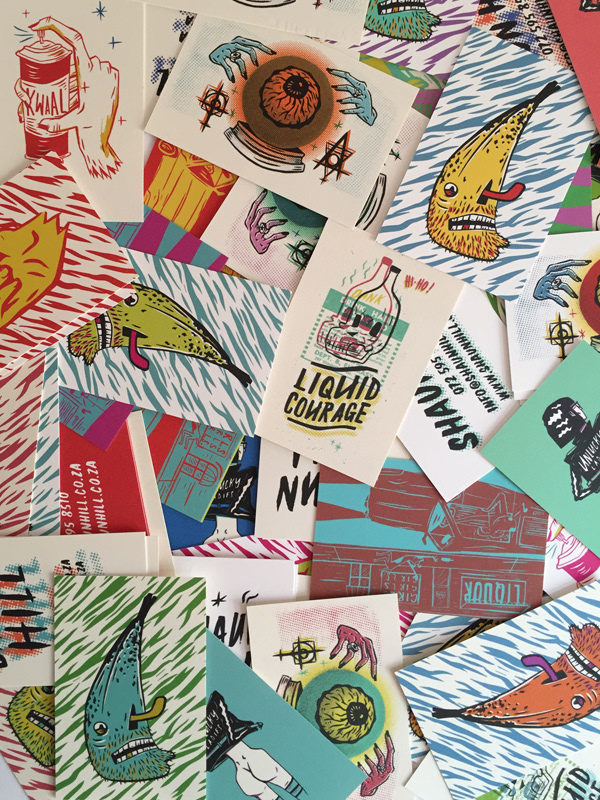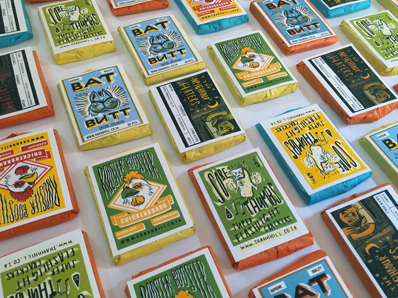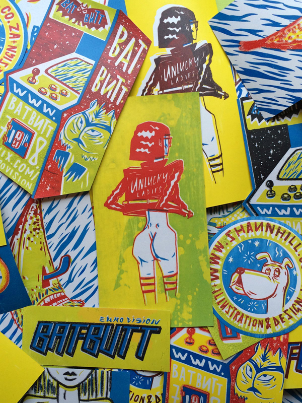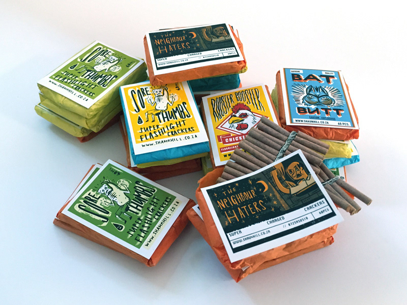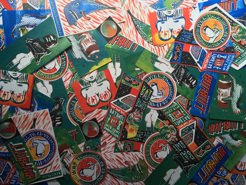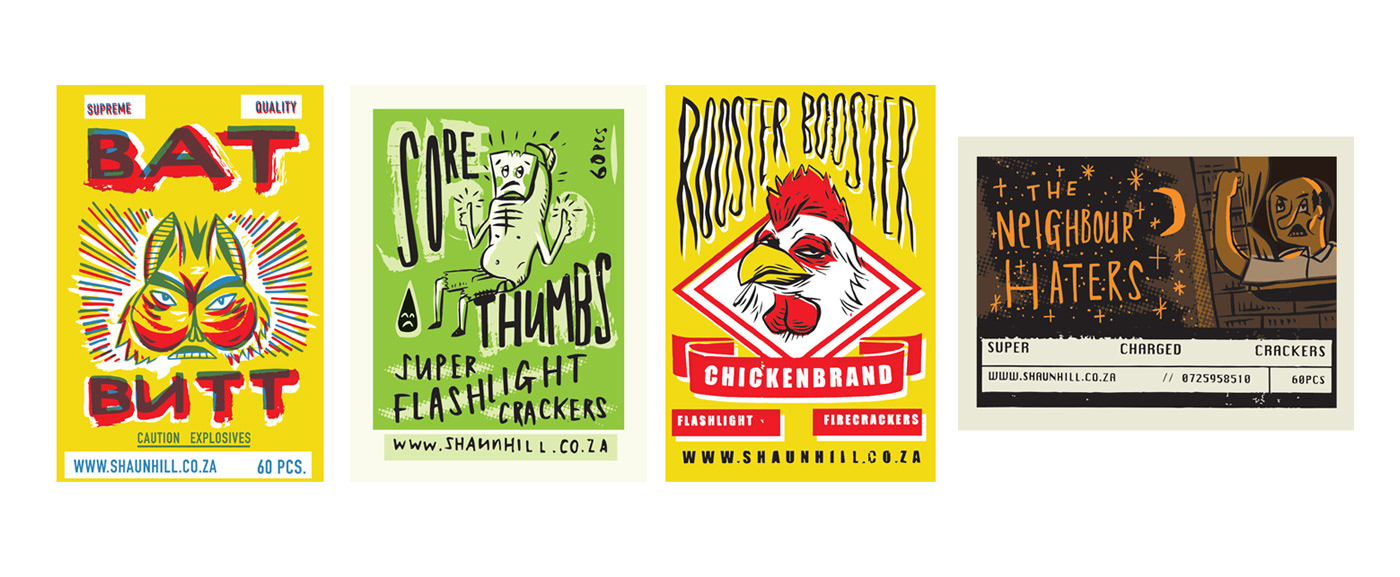 2015 self promotional stickers, firecrackers, business cards and posters.